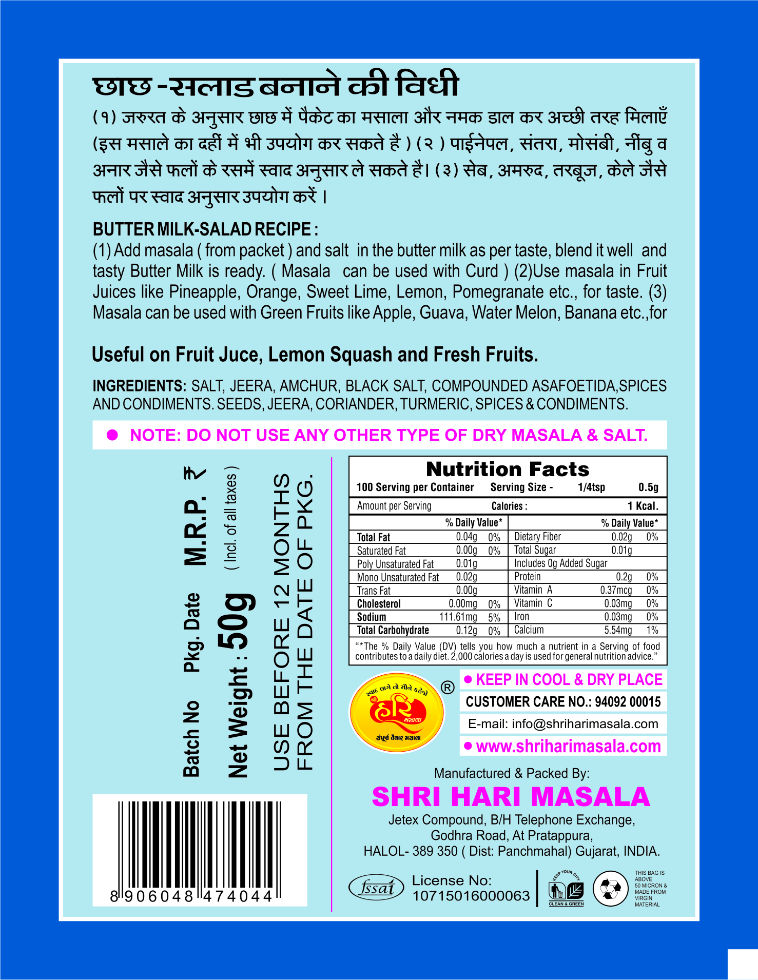 Shri Hari Ready To Cook Buttermilk – Salad Masala which includes all spice you do not add any masala in this masala.