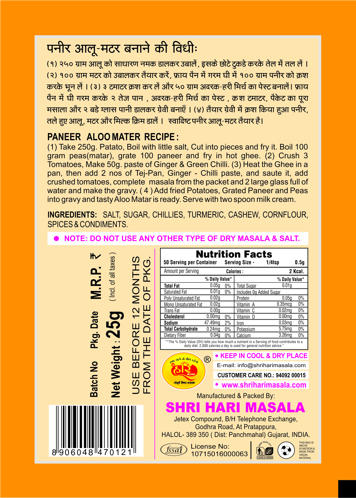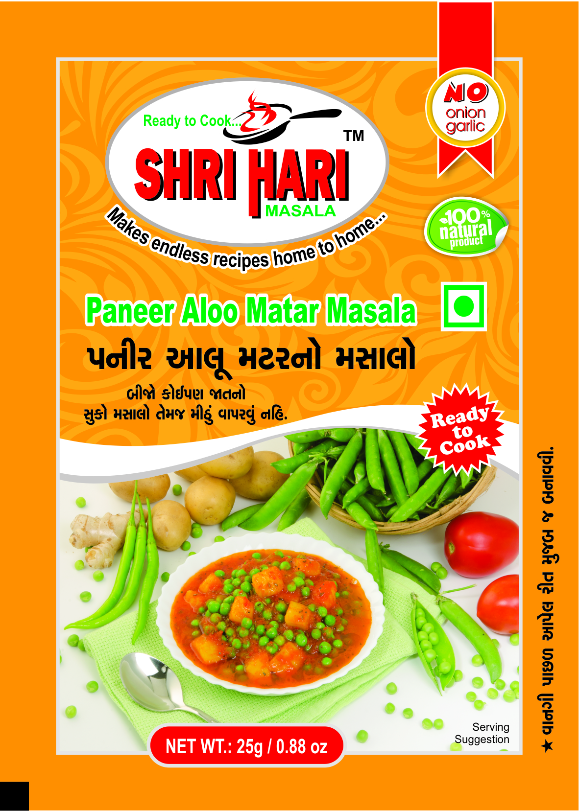 Shri Hari Ready To Cook Paneer Aloo Matar Masala which includes allspice you do not add any masala in this masala.
