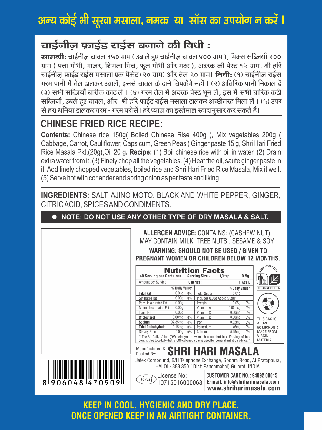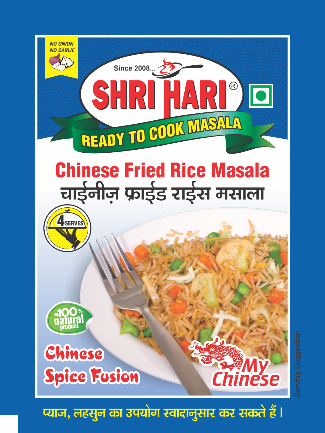 Contents: Chinese rice 150g( Boiled Chinese Rise 400g ), Mix vegetables 200g ( Cabbage, Carrot, Cauliflower, Capsicum, Green Peas) Ginger paste 15 g, Shri Hari Fried Rice Masala Pkt.(20g),Oil 20 g.