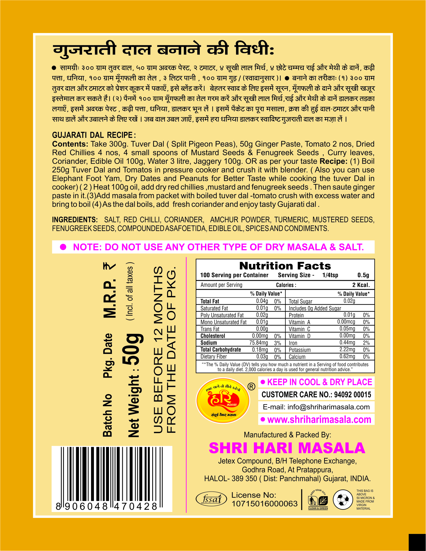 Shri Hari Ready To Cook Gujarati Dal Masala which includes all spice you do not add any masala in this masala.