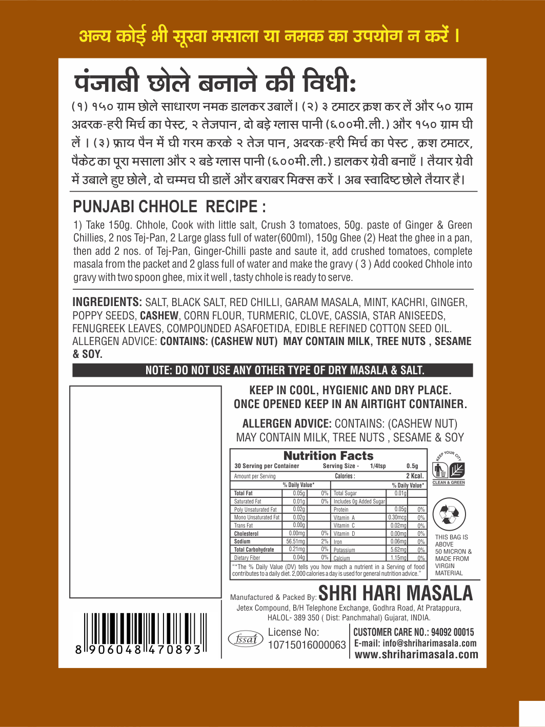 Shri Hari Ready To Cook Punjabi Chhole Masala which includes allspice you do not add any masala in this masala.