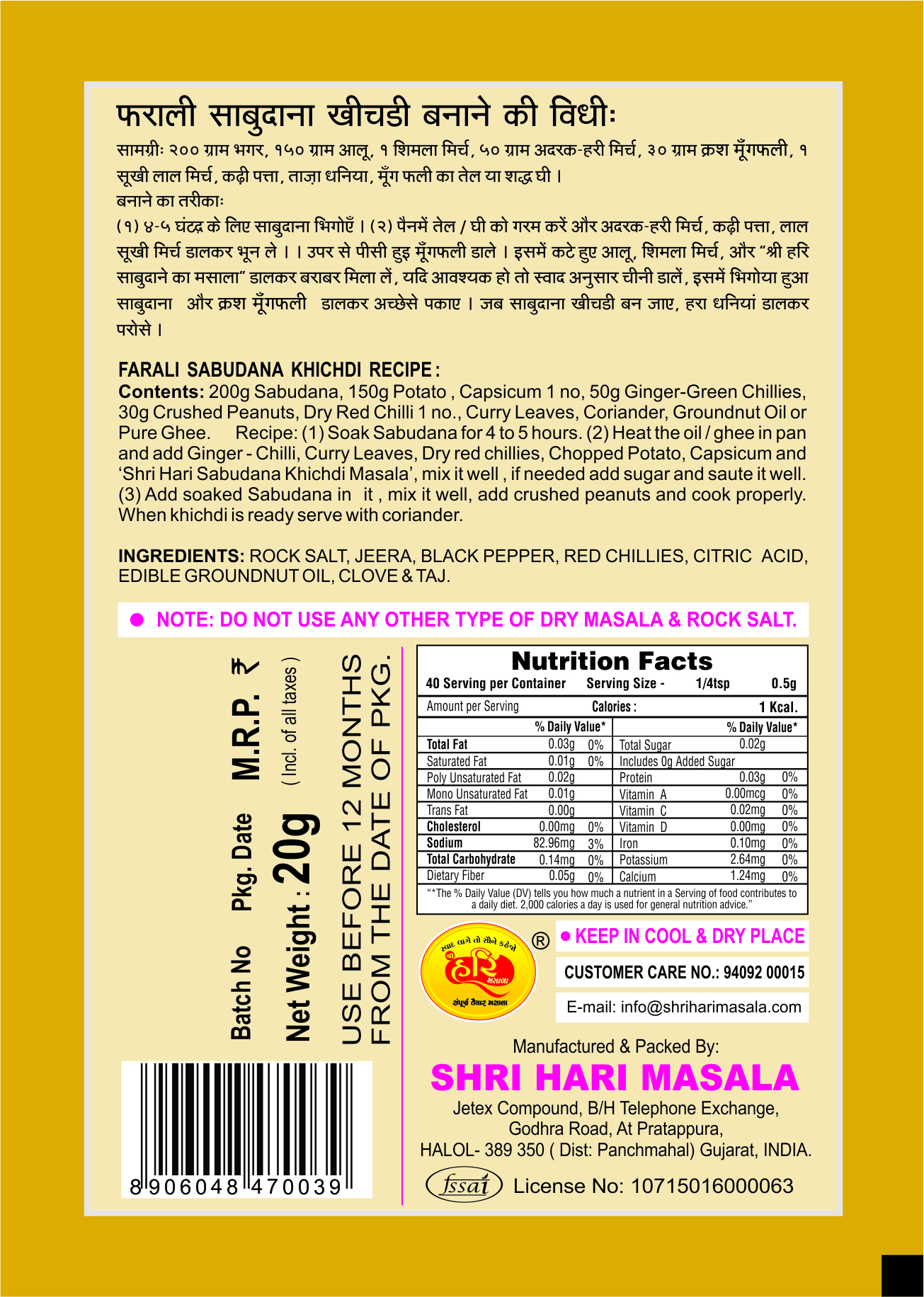 Shri Hari Ready To Cook Farali Sabudana Khichdi Masala which includes allspice you do not add any masala in this masala.
