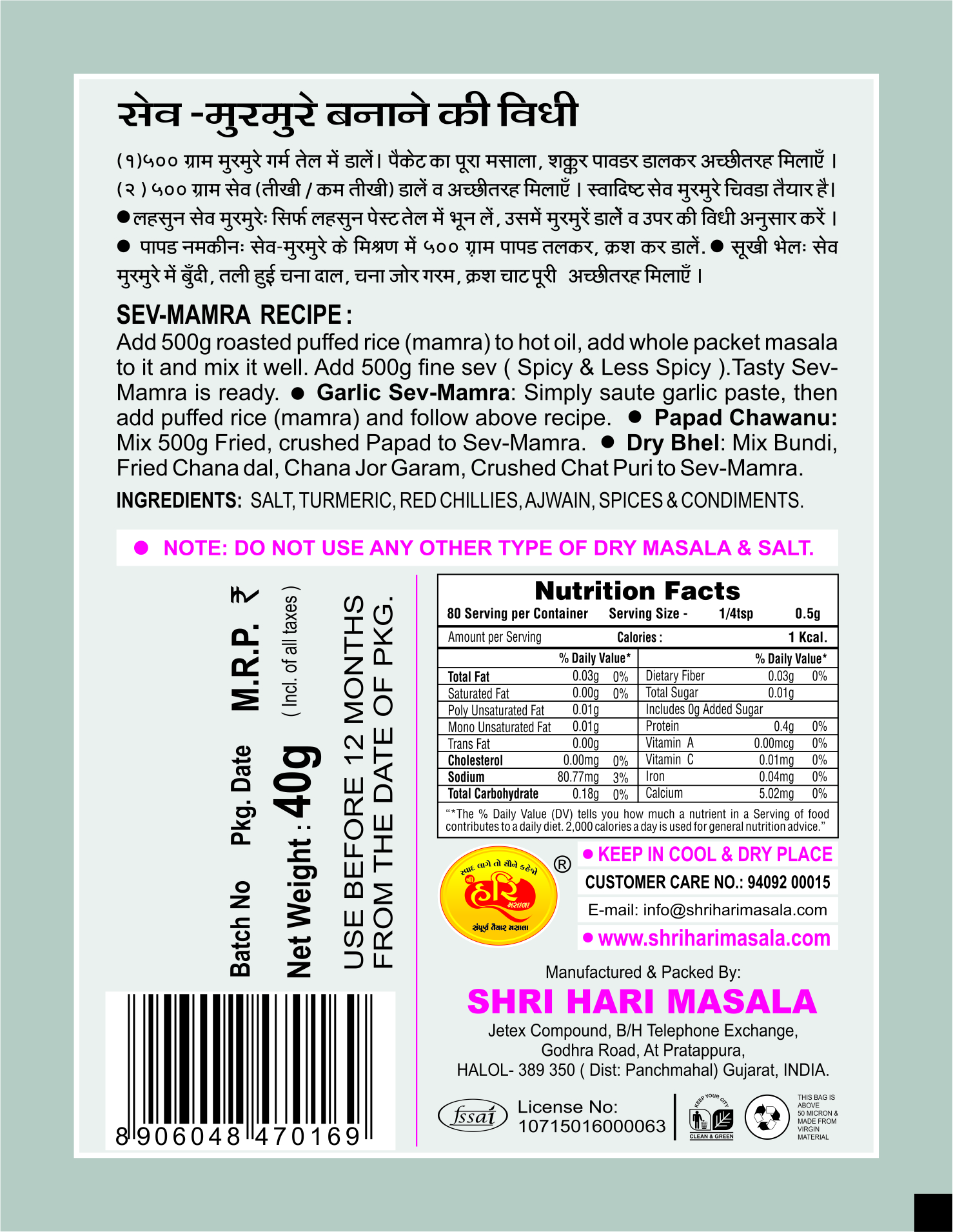 Shri Hari Ready To cook Sev Mamra Masala which includes allspice you do not add any masala in this masala.