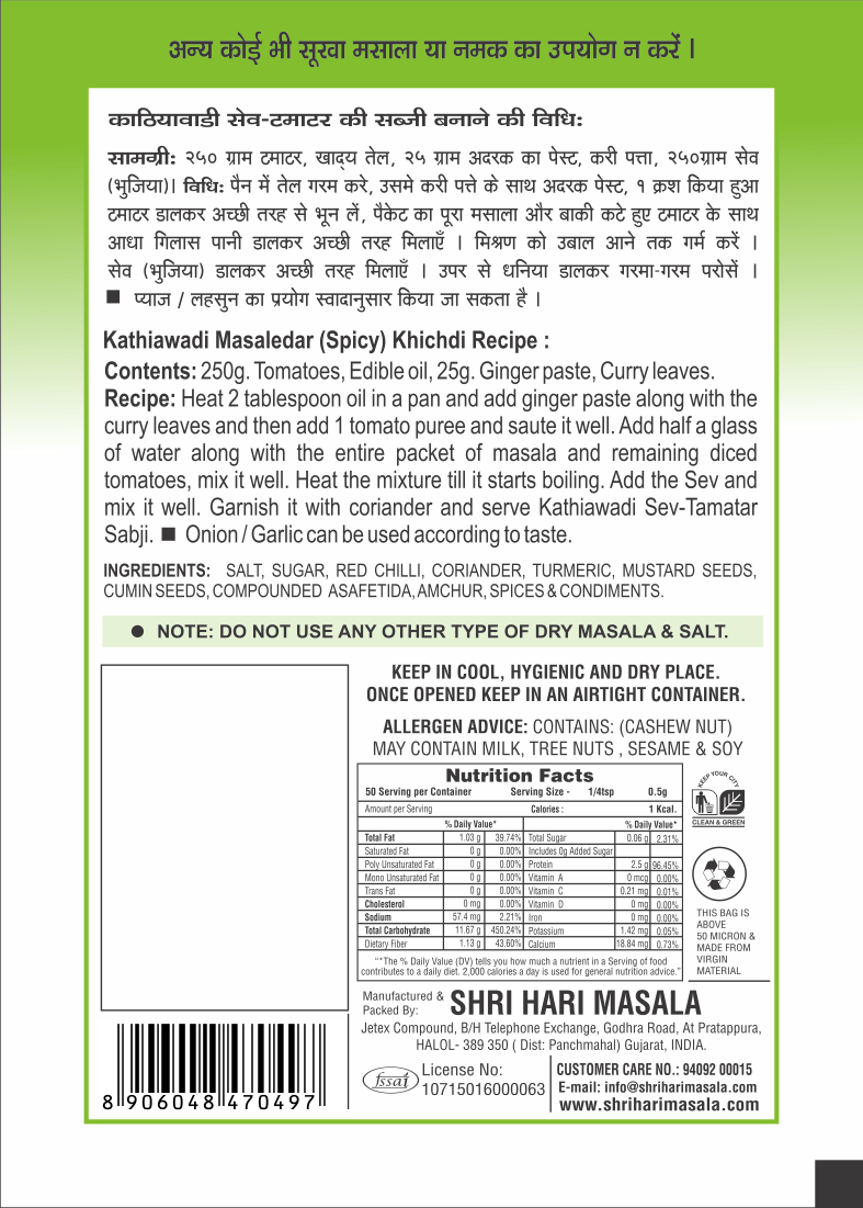 Saute ginger-chilli paste and tejpan, crushed tomatoes, then add all the “Shri Hari Paneer Kaju Curry Masala” from packet and two big glass water with grated paneer. The tasty gravy is ready.