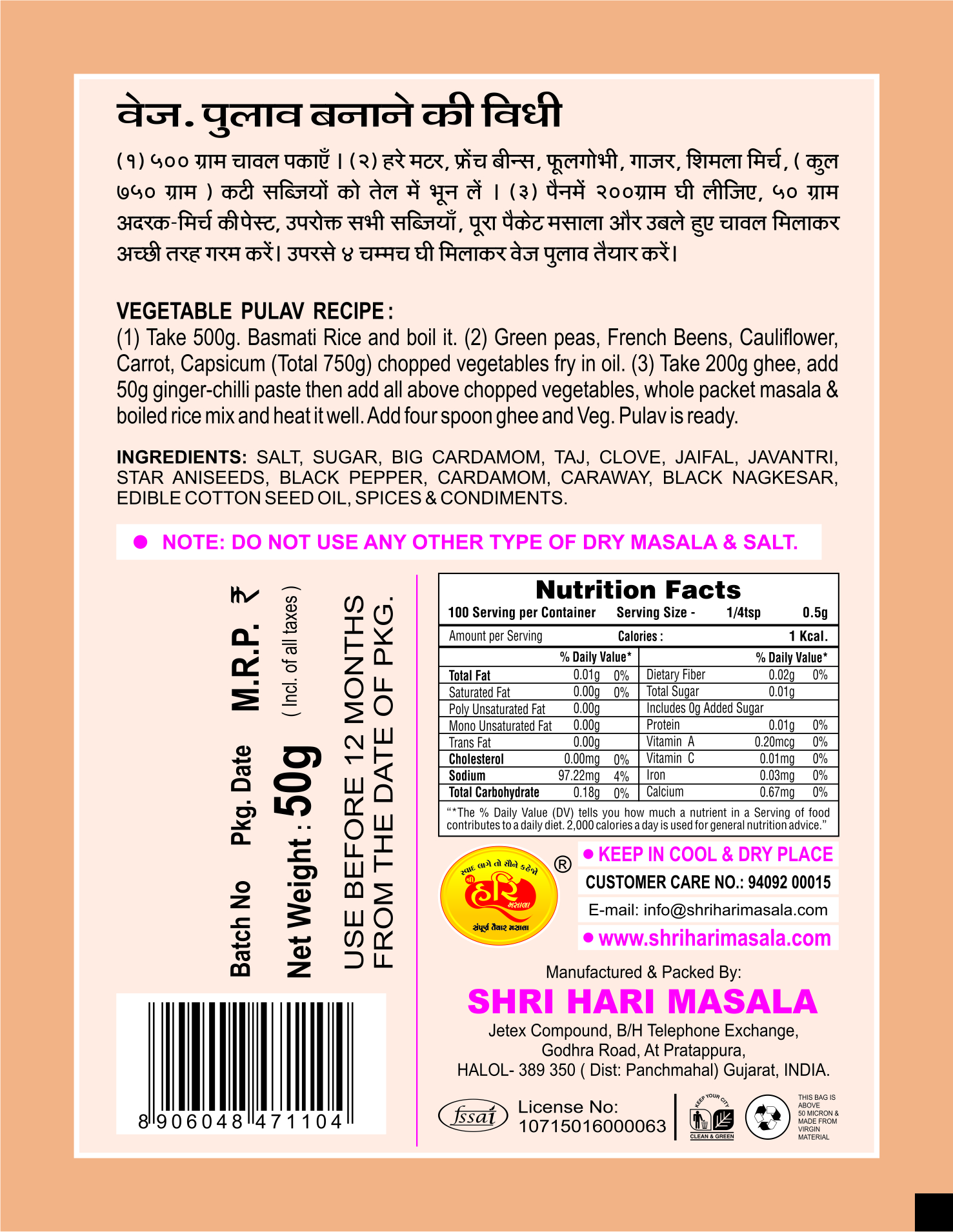Shri Hari Ready To cook Veg. Biryani Pulav Masala which includes allspice you do not add any masala in this masala.
